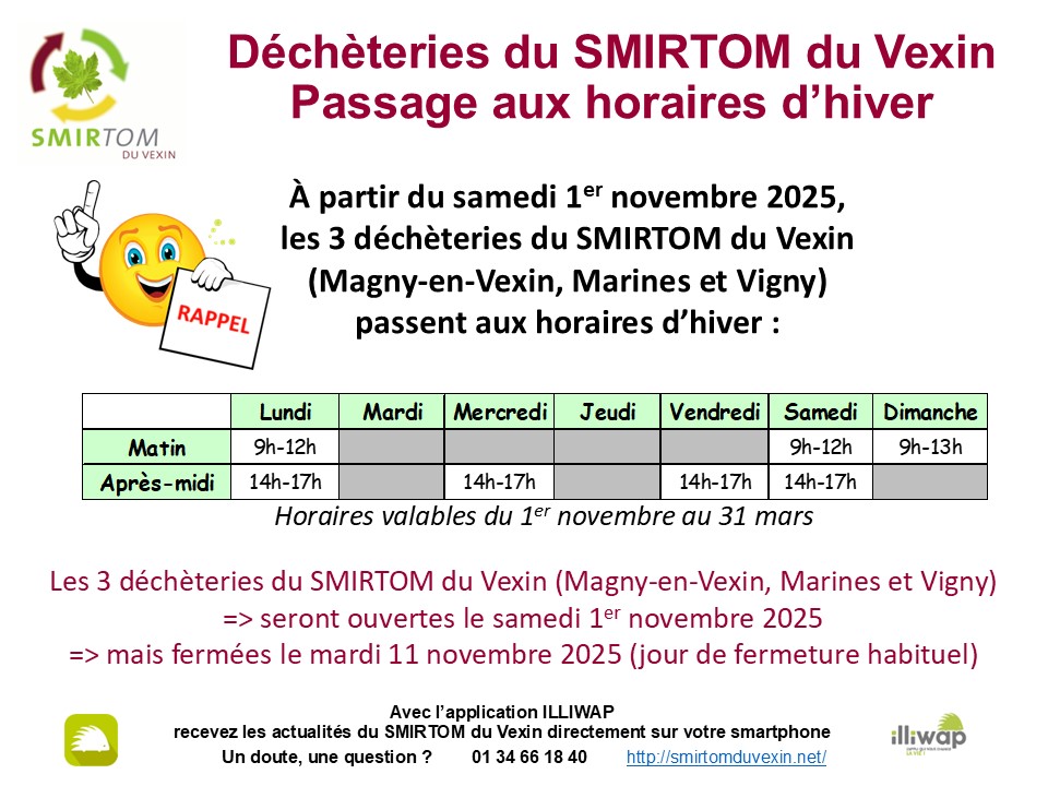 Déchèteries du SMIRTOM : passage aux horaires d’hiver Posted on 21 octobre 202430 octobre 2025 by Evelyne BOUCHONNET Info Rapide Nouveau calendrier du SMIRTOM 2025 Retrouvez le nouveau calendrier du SMIRTOM pour 2025 et les consignes de tri. Rappel des jours de ramassage des encombrants : mercredi 12 mars 2025 mercredi 10 septembre 2025 Horaires d’ouverture de la Mairie : Mardi : 9h00 – 12h00 Jeudi : 17h00 – 19h00 Vendredi : 9h00 – 12h00 Samedi : 10h00 – 12h00